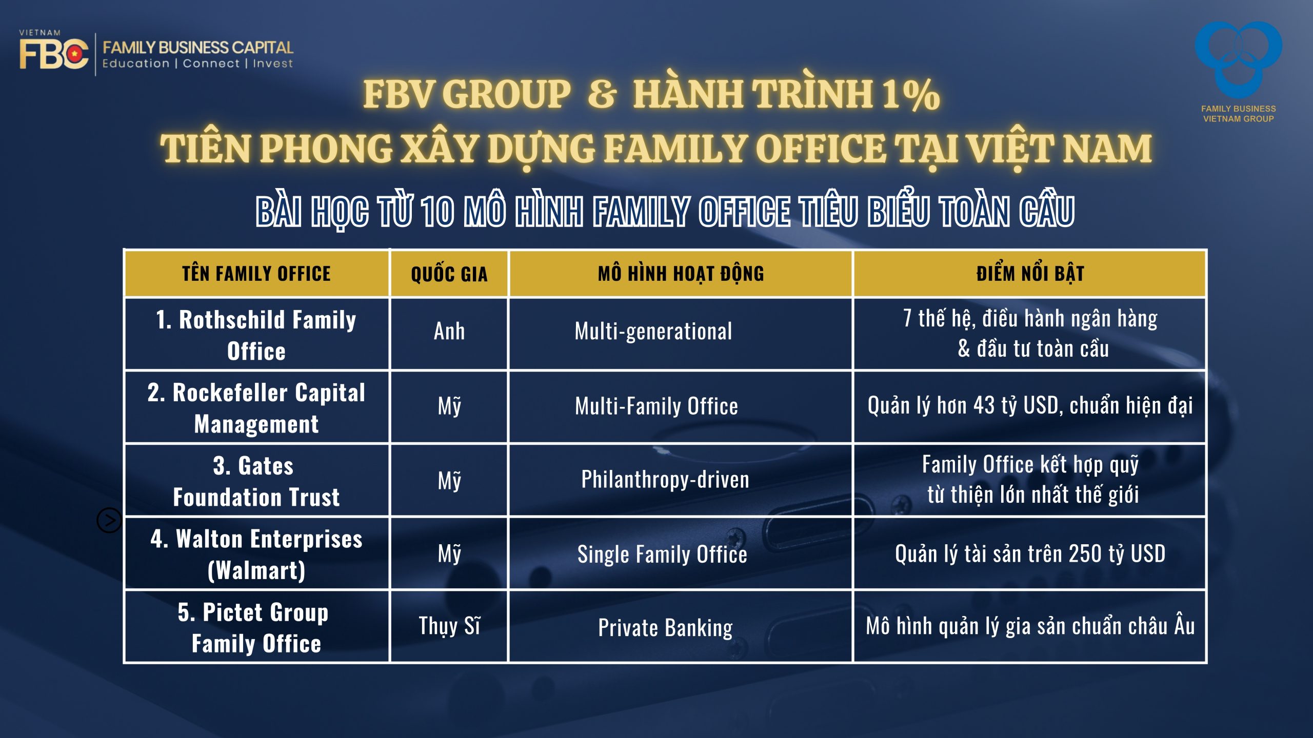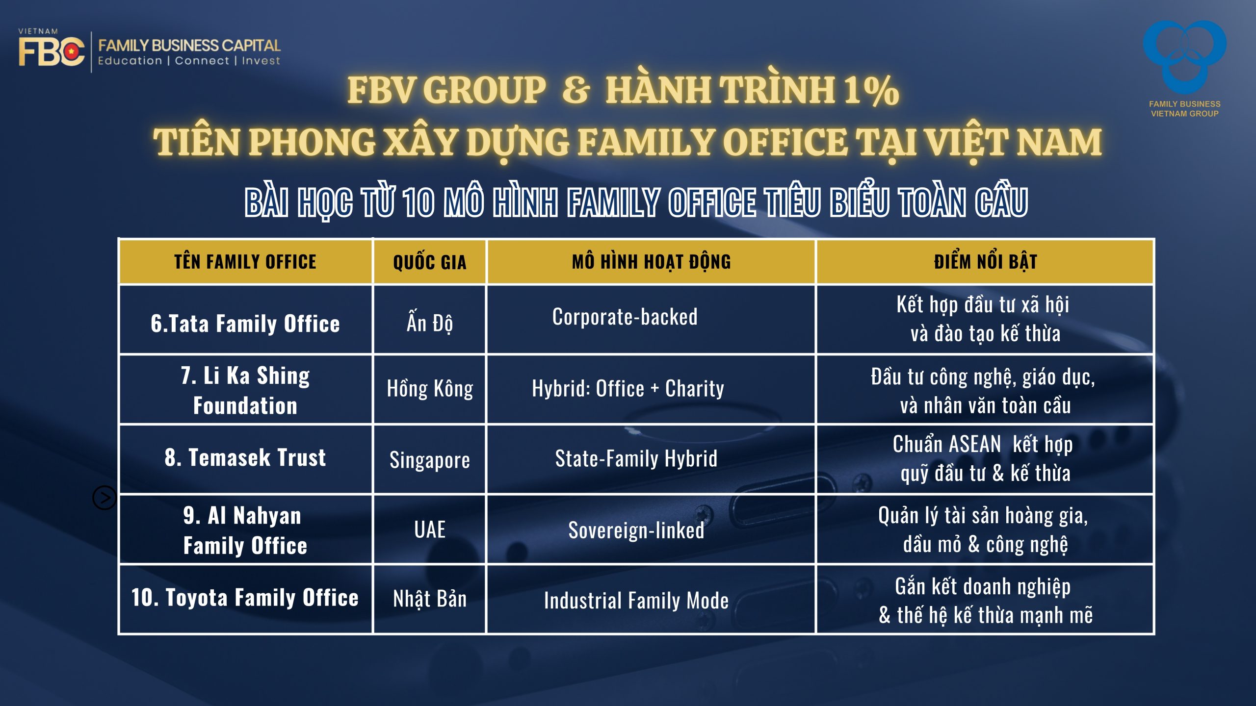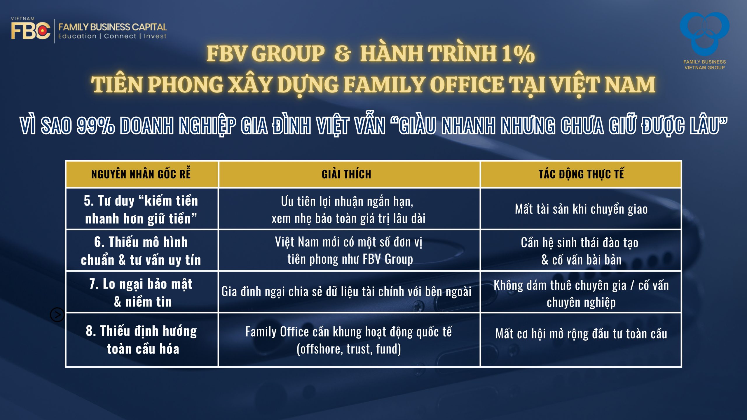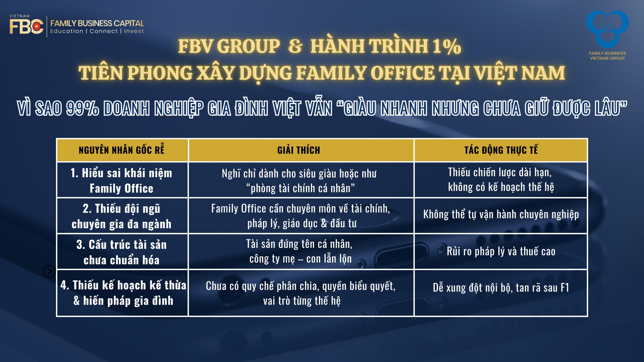 👉 Hãy trở thành một trong những doanh nghiệp gia đình đầu tiên tại Việt Nam tiên phong xây dựng Family Office cùng FBV Group. Liên hệ ngay hôm nay để bắt đầu hành trình kiến tạo di sản cho thế hệ kế thừa của bạn. FBV Group (Family Business Vietnam) đơn vị tiên phong trong lĩnh vực Quản lý Gia sản và Đào tạo Thế hệ Kế thừa tại Việt Nam, với sứ mệnh Kết nối, Phát triển, Bền vững và tầm nhìn Vươn tầm quốc tế, Giữ gìn giá trị Việt.