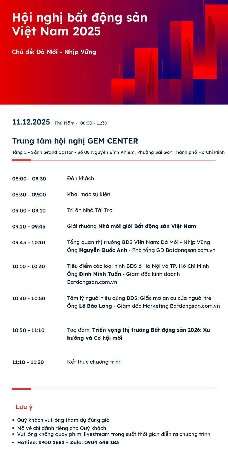 Hội nghị Bất động sản Việt Nam 2025 (Vietnam Real Estate Summit – VRES) do Batdongsan.com.vn – PropertyGuru Group tổ chức đã chính thức khởi động tại Hà Nội (InterContinental Landmark72) và TP.HCM (GEM Center) trong tháng 12/2025, với chủ đề “Đà mới – Nhịp vững.”